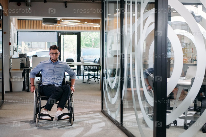 В крупной современной корпорации решительный бизнесмен в инвалидной коляске движется по коридору, олицетворяя расширение прав и возможностей и инклюзивность в корпоративном мире