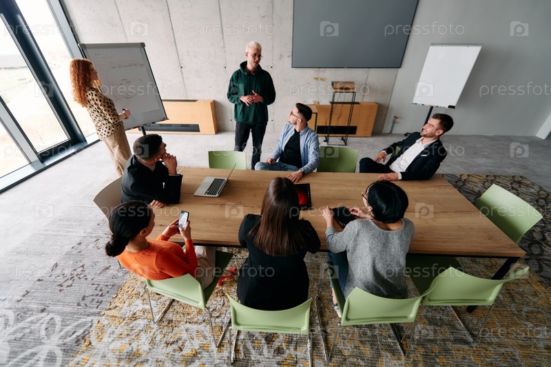Разнообразная многонациональная бизнес-команда участвует в совместной встрече, обсуждая стратегии и решения в современной офисной обстановке