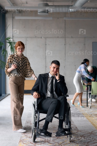 Бизнес-директор в инвалидной коляске уверенно передвигается по современному офису рядом со своим коллегой, демонстрируя командную работу, лидерство и инклюзивность на рабочем месте