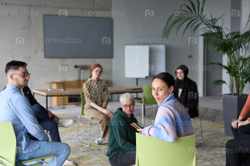 Группа разнообразных деловых людей сосредоточенно сидит в современном офисе, активно участвуя в обучающем занятии под руководством инструктора, уделяя особое внимание последним технологическим достижениям в мире бизнеса