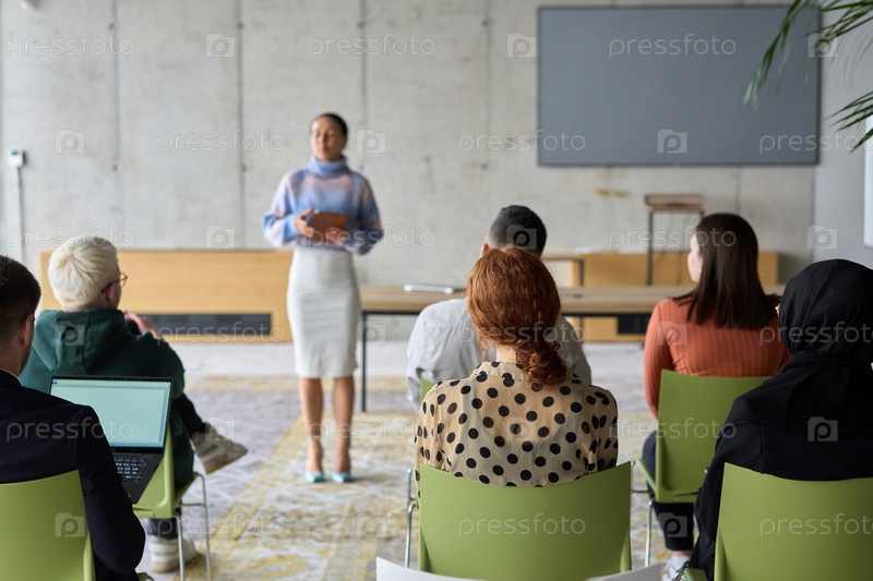 Бизнес-леди-лидер проводит встречу с коллегами, обсуждая проблемы бизнеса, маркетинговые стратегии и новые планы роста и успеха