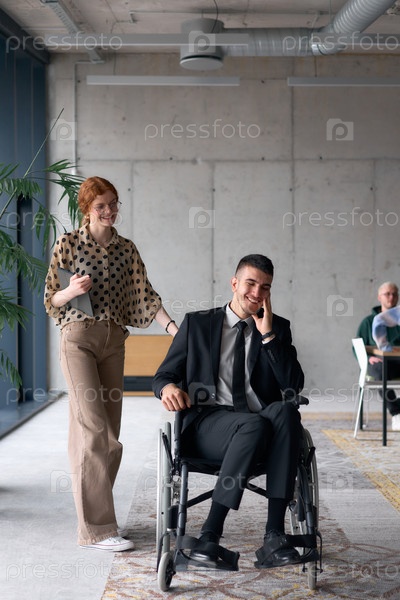 Бизнес-директор в инвалидной коляске уверенно передвигается по современному офису рядом со своим коллегой, демонстрируя командную работу, лидерство и инклюзивность на рабочем месте