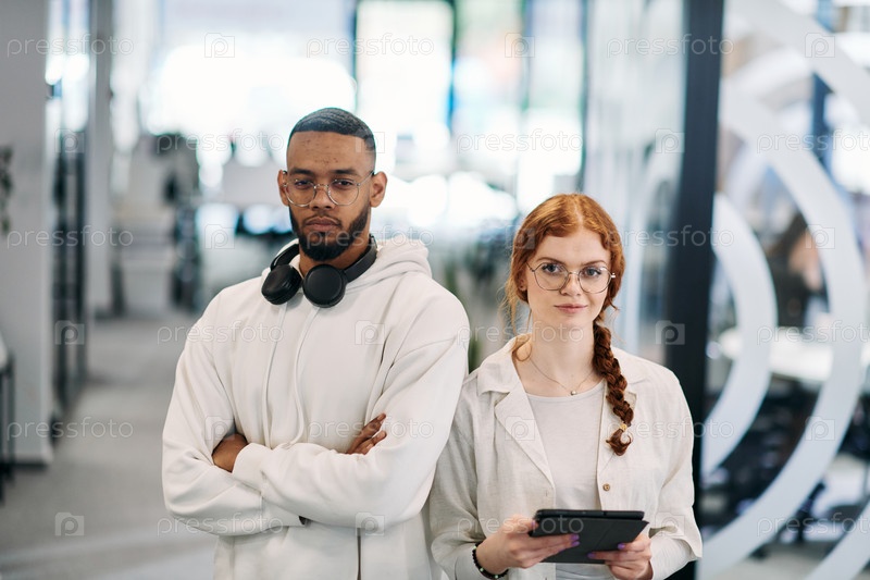 В современном офисе афроамериканский бизнесмен и его коллега-бизнесмен с ее яркими рыжими волосами участвуют в сессиях по совместному решению проблем