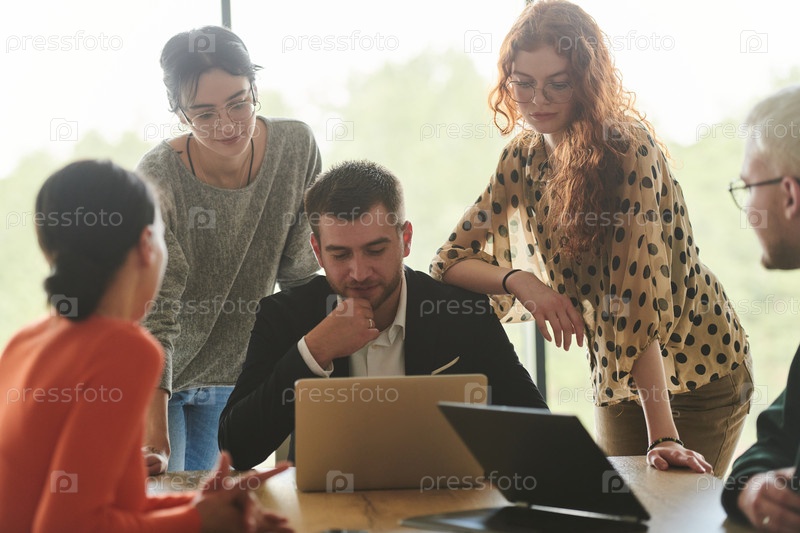 Разнообразная многонациональная бизнес-команда участвует в совместной встрече, обсуждая стратегии и решения в современной офисной обстановке