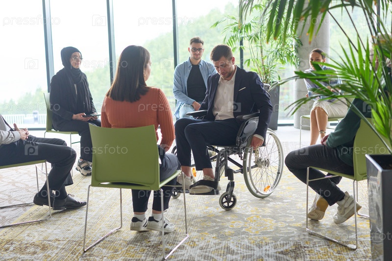Корпоративная встреча бизнес-команды с менеджером или тренером. Группа счастливых разнообразных, многорасовых людей, сидящих в кругу