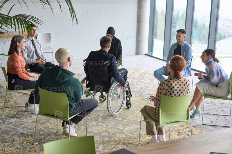 Корпоративная встреча бизнес-команды с менеджером или тренером. Группа счастливых разнообразных, многорасовых людей, сидящих в кругу