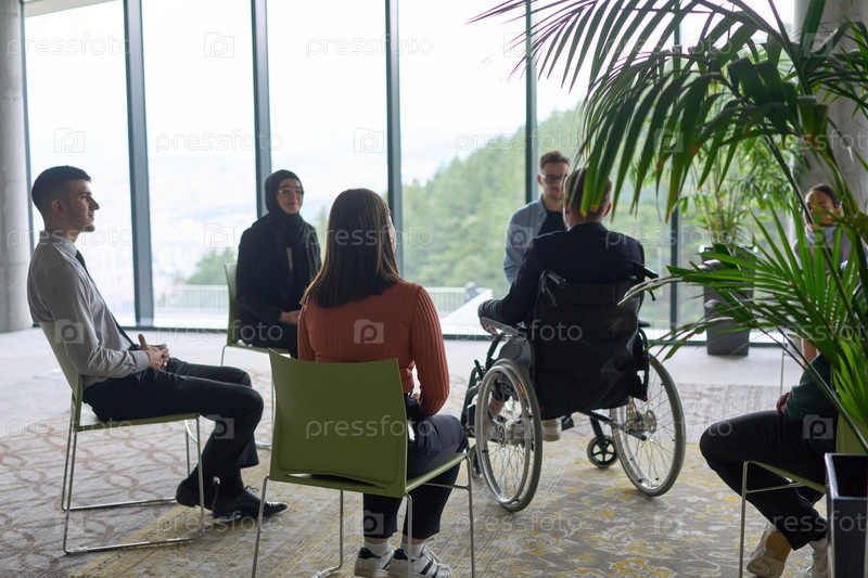 Корпоративная встреча бизнес-команды с менеджером или тренером. Группа счастливых разнообразных, многорасовых людей, сидящих в кругу