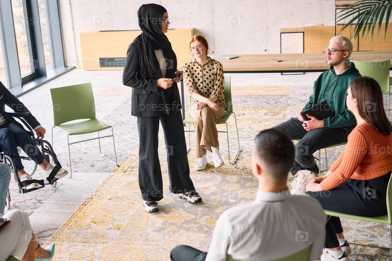 Корпоративная встреча бизнес-команды с менеджером или тренером. Группа счастливых разнообразных, многорасовых людей, сидящих в кругу