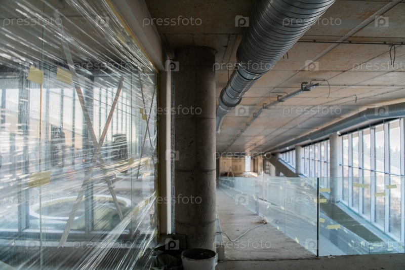 Захватывающий вид на строящееся современное деловое здание, демонстрирующее его грубый промышленный интерьер с открытыми стальными балками и бетонными стенами, залитыми теплыми золотистыми оттенками заката