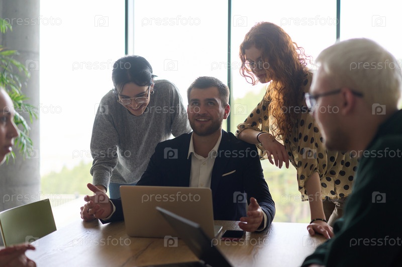 Разнообразная команда профессионалов в сфере бизнеса вместе с директором компании анализируют успехи бизнеса на ноутбуке в современном офисе, обсуждают стратегию и прогресс