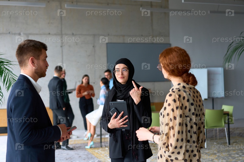 Группа разнообразных деловых людей ведет беседу во время рабочего перерыва в офисе, на заднем плане видны их коллеги, что способствует сотрудничеству и налаживанию связей