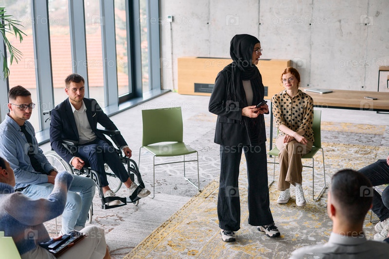 Корпоративная встреча бизнес-команды с менеджером или тренером. Группа счастливых разнообразных, многорасовых людей, сидящих в кругу