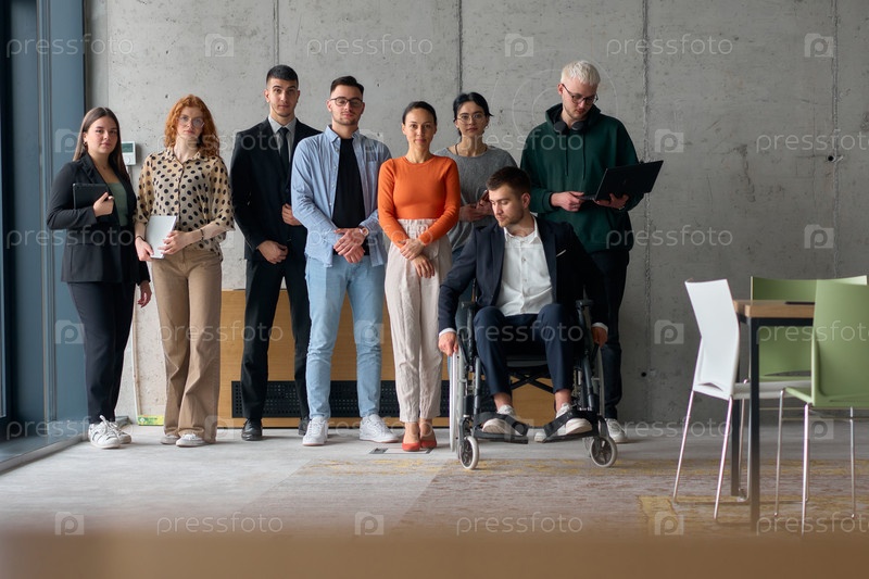 Многонациональная бизнес-команда сотрудничает в современном офисе с директором в инвалидной коляске