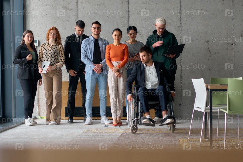 Многонациональная бизнес-команда сотрудничает в современном офисе с директором в инвалидной коляске
