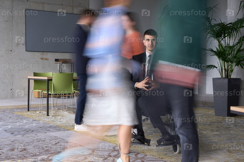 Бизнесмен в инвалидной коляске передвигается по оживленному офису в окружении коллег, которые активно заняты своей работой и сотрудничеством