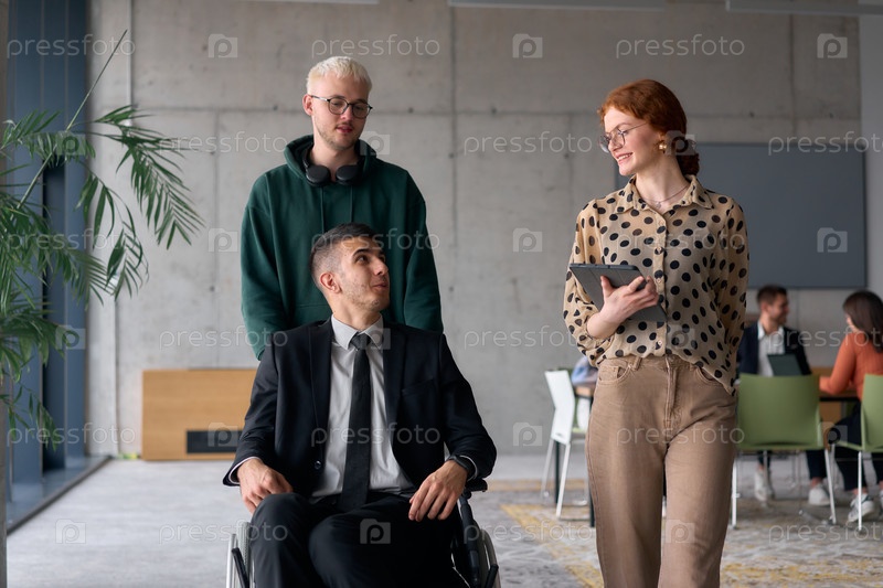 Разнообразная команда коллег по бизнесу, включая директора в инвалидной коляске, участвует в совместной дискуссии, перемещаясь по современному офисному пространству