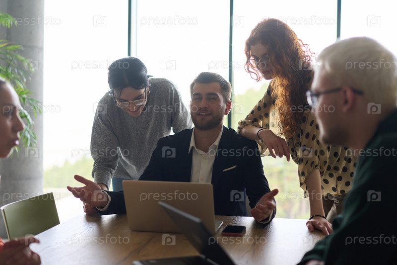 Разнообразная команда профессионалов в сфере бизнеса вместе с директором компании анализируют успехи бизнеса на ноутбуке в современном офисе, обсуждают стратегию и прогресс