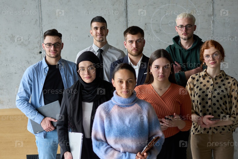 Разнообразная и целеустремленная команда профессионалов бизнеса уверенно стоит в офисе, готовая взяться за новые бизнес-планы и задачи, концентрируясь на успехе и росте