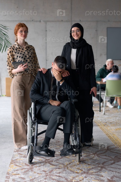 Разнообразная бизнес-команда уверенно позирует, включая улыбающегося директора, сидящего в инвалидном кресле, в окружении двух коллег-женщин, одна из которых в хиджабе, а другая держит планшет, в современной офисной обстановке