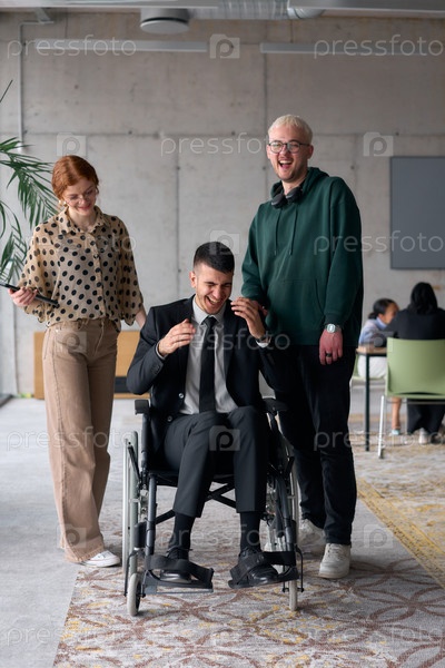 Группа веселых коллег по бизнесу, включая бизнесмена в инвалидной коляске, позируют вместе в современном офисе, демонстрируя командную работу и инклюзивность