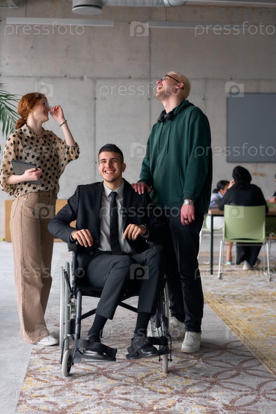 Группа веселых коллег по бизнесу, включая бизнесмена в инвалидной коляске, позируют вместе в современном офисе, демонстрируя командную работу и инклюзивность