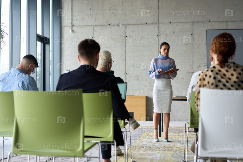 Бизнес-леди-лидер проводит встречу с коллегами, обсуждая проблемы бизнеса, маркетинговые стратегии и новые планы роста и успеха