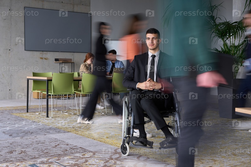 Бизнесмен в инвалидной коляске передвигается по оживленному офису в окружении коллег, которые активно заняты своей работой и сотрудничеством
