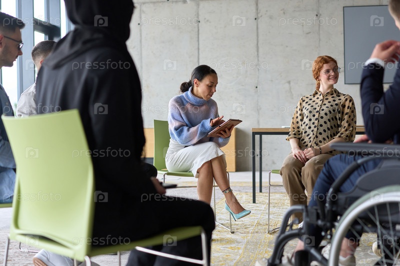 Корпоративная встреча бизнес-команды с менеджером или тренером. Группа счастливых разнообразных, многорасовых людей, сидящих в кругу