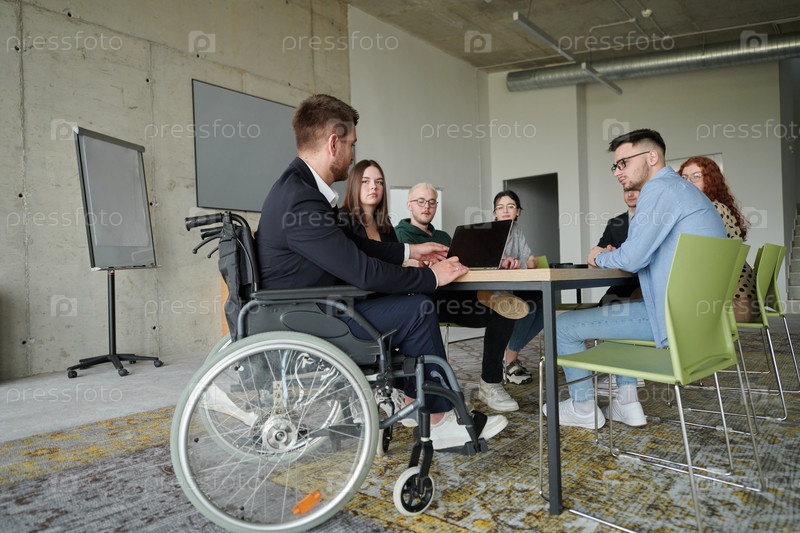 Группа разнообразных деловых людей, включая мужчину в инвалидной коляске, сотрудничает во время совещания в современном офисе