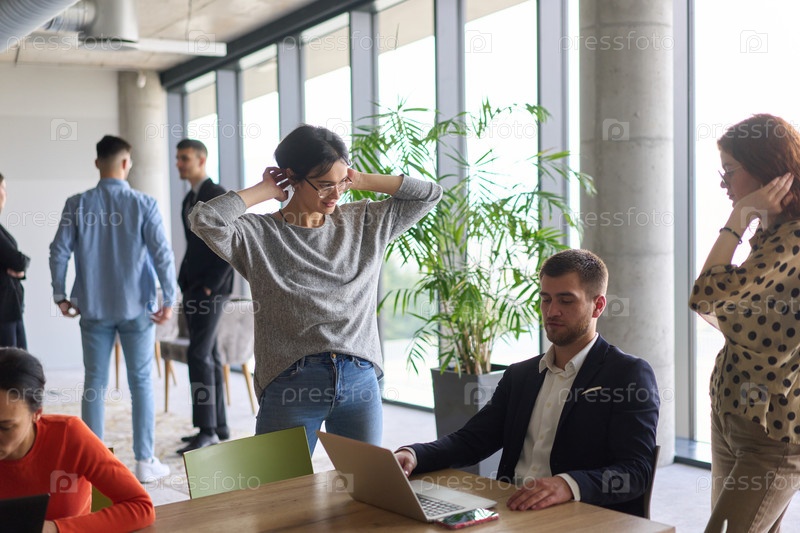 Разнообразная команда профессионалов в сфере бизнеса вместе с директором компании анализируют успехи бизнеса на ноутбуке в современном офисе, обсуждают стратегию и прогресс