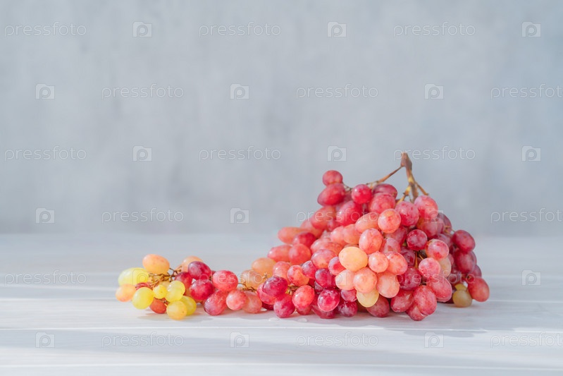 Гроздь розового винограда на столе. Свежий сочный красный виноград на сером фоне