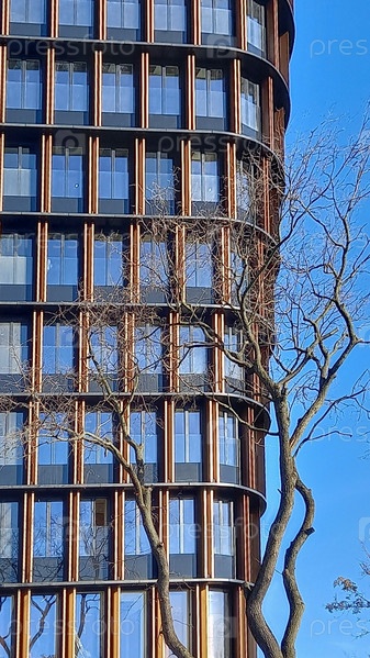 Небоскреб и голое дерево в синих тонах. Бизнес, городской вид. Крупный план