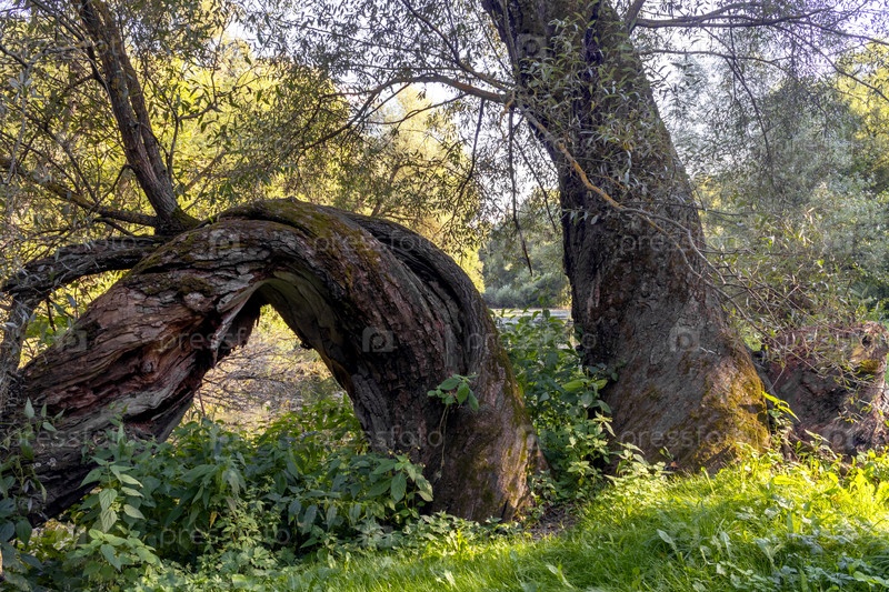 Большие старые причудливые деревья на берегу реки. Красота в природе