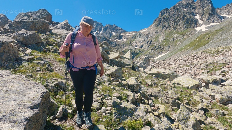 Женщина-туристка в альпийском пейзаже. Туристка с рюкзаком, бейсболкой и треккинговой палкой стоит среди скалистого пейзажа, любуясь суровым горным пейзажем под ясным голубым небом