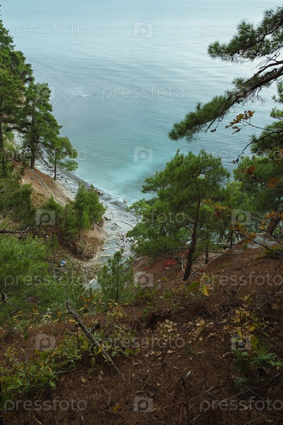 Безмятежный прибрежный вид со скалы, возвышающейся над спокойным бирюзовым морем. Сосны и листва обрамляют сцену, а внизу видна скалистая береговая линия. Дикий пляж
