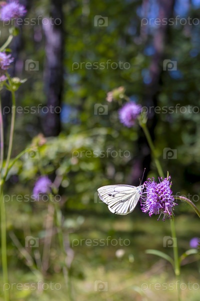 Белая бабочка на фиолетовых цветах в лесу. Копировать пространство, место для текста. Крупный план