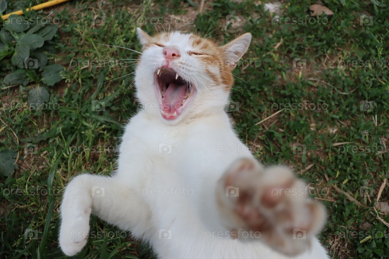 Белая кошка зевает, лежа на зеленой траве