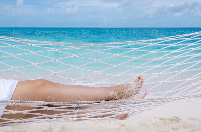 Молодая женщина лежит в гамаке у океана
