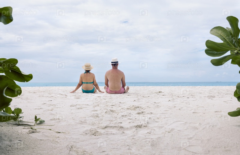 Молодая супружеская пара сидит на песке на пляже и наслаждается прекрасным морским пейзажем. Мужчина и его жена в купальниках на берегу океана. Вид со спины