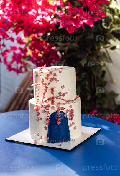 Милый белый двухъярусный вкусный торт на синем столе. Сладость украшена розовыми цветами