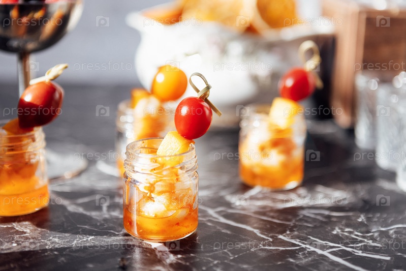 Крупный план маленьких баночек, наполненных креветками и разноцветными овощами. Стеклянные баночки украшены помидорами черри и апельсином сверху