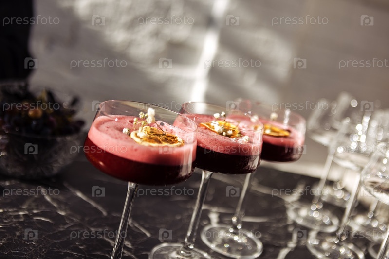 Розовые кисло-сладкие ягодные коктейли с пышной пеной в элегантных бокалах на длинной ножке. Вкусные напитки украшены долькой апельсина и цветами