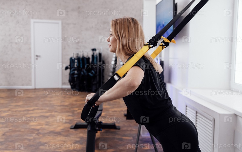 Красивая спортсменка в черной спортивной одежде использует систему TRX для разминки и тренировок
