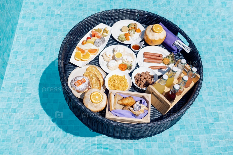 В роскошном бассейне находится плавающий поднос для завтрака с различными блюдами и напитками