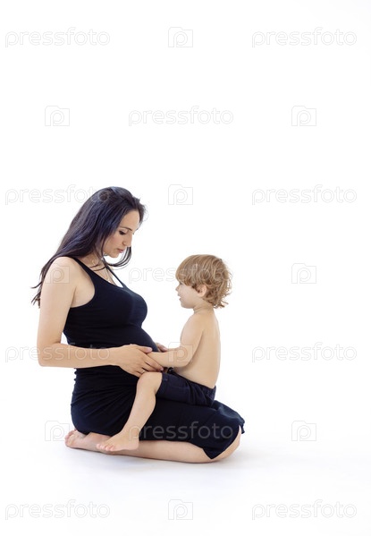 Молодая беременная женщина в черном платье сидит на полу с маленьким сыном. Милый ребенок касается живота мамы. Белый изолированный фон