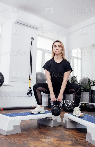 Молодая женщина в черной спортивной одежде стоит на ступеньках и приседает с гирей