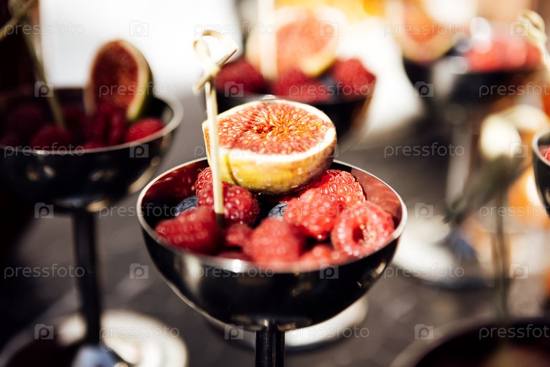 Полированная серебряная чаша наполнена разнообразными свежими ягодами и инжиром. Вкусная фруктовая закуска на шведском столе