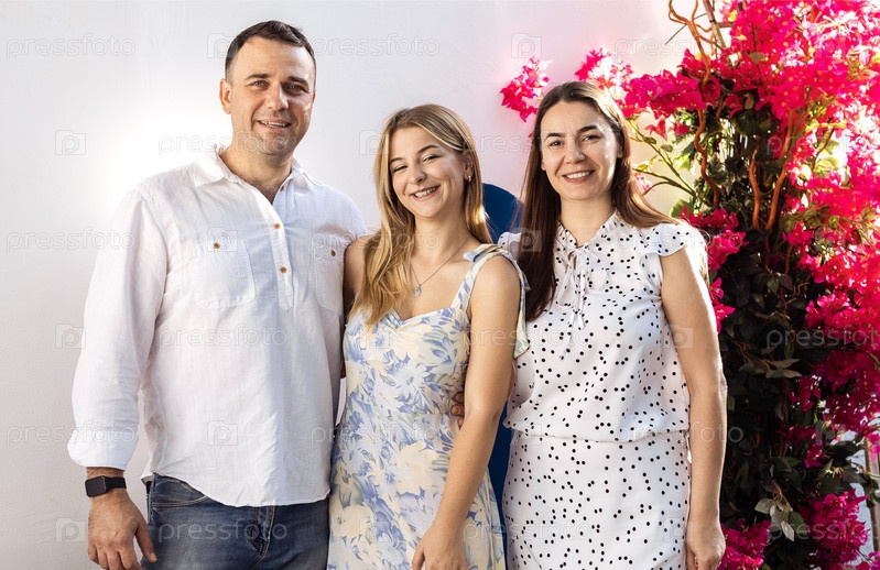 Милая девчонка-подросток и ее родители в нарядных нарядах улыбаются и позируют. Радостная девочка, ее папа и мама обнимаются на праздничной встрече
