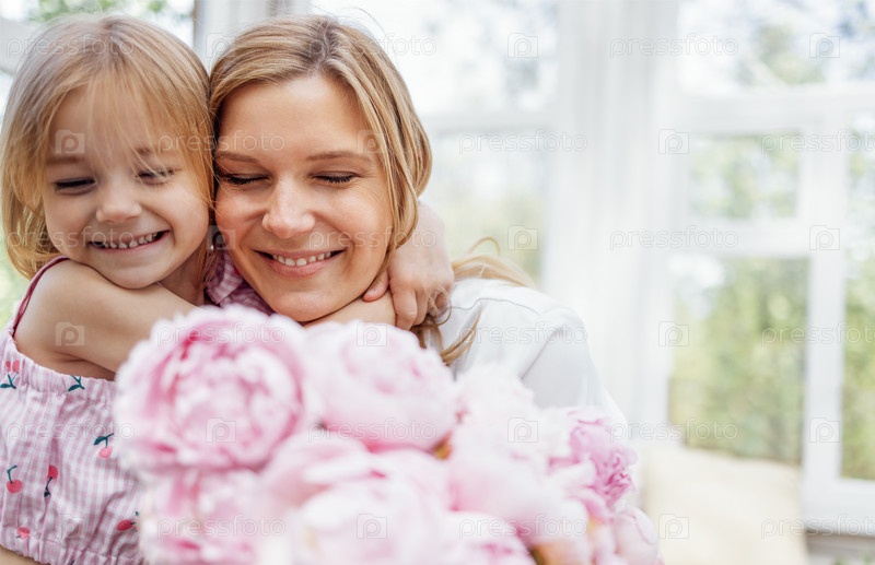 Объятия милой девочки и ее счастливой улыбающейся мамы. Прекрасные розовые пионы на переднем плане. Концепция ко Дню матери