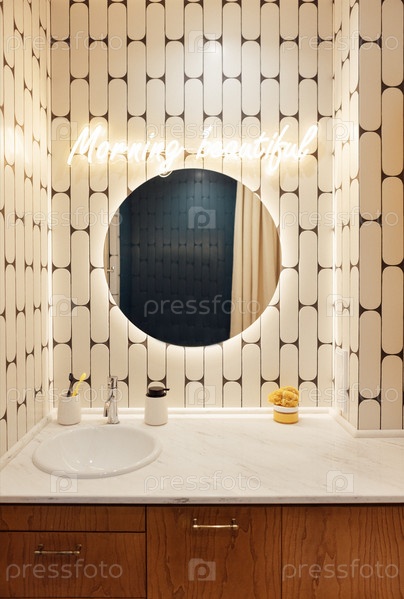 Современный стильный интерьер ванной комнаты. Крупный план мраморной столешницы с раковиной и большим круглым освещенным зеркалом